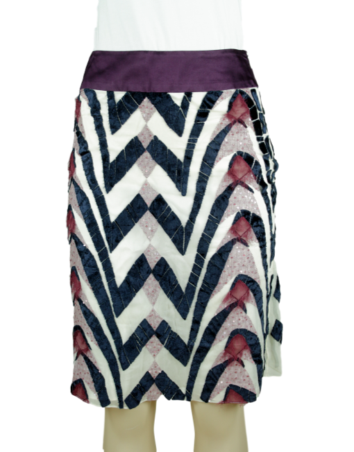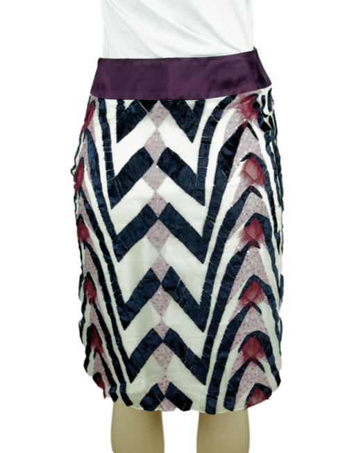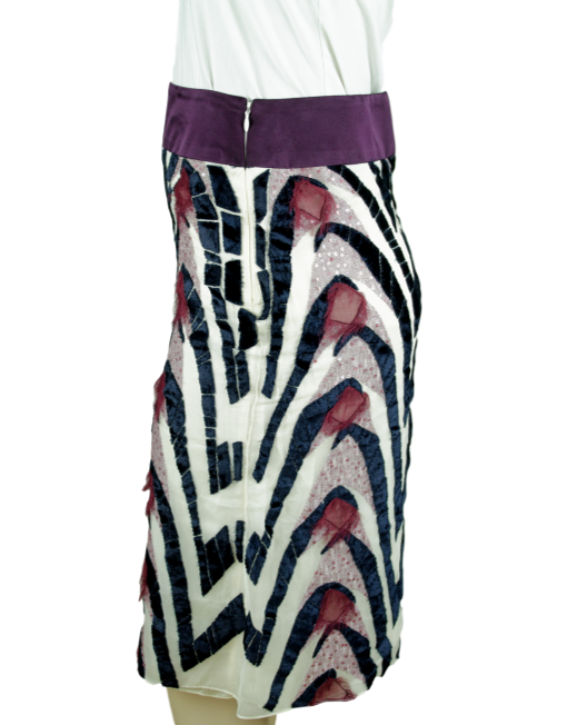 Design Details: White, Blue and Burgundy Carolina Herrera Silk texture skirt is knee-length a-line pattern with hidden zip closure on side.