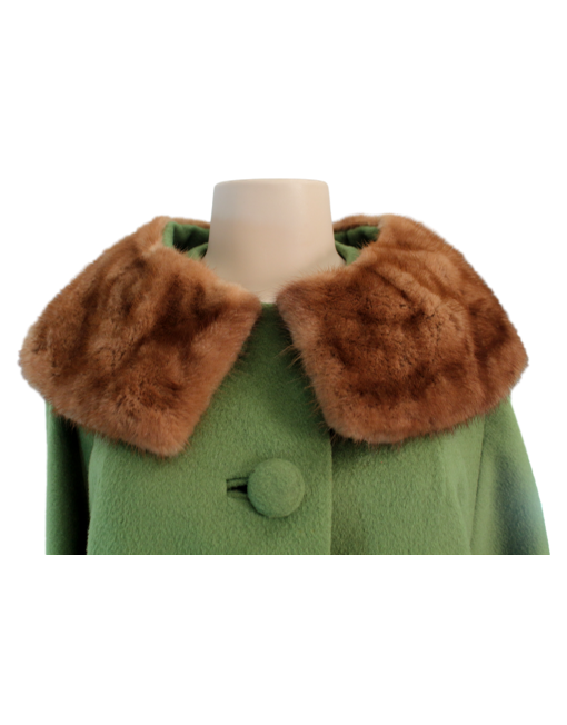 Design Details: 1960's Green Dumas vintage wool swing coat has slit pockets, button closure, pastel mink collar is fulling lined