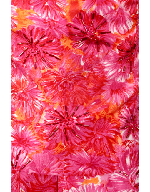 Design Details: Pink Silk Lillie Rubin hot pink floral two-piece halter and pant with embellishment. Halter has hidden side zipper and pant has back hidden sipper