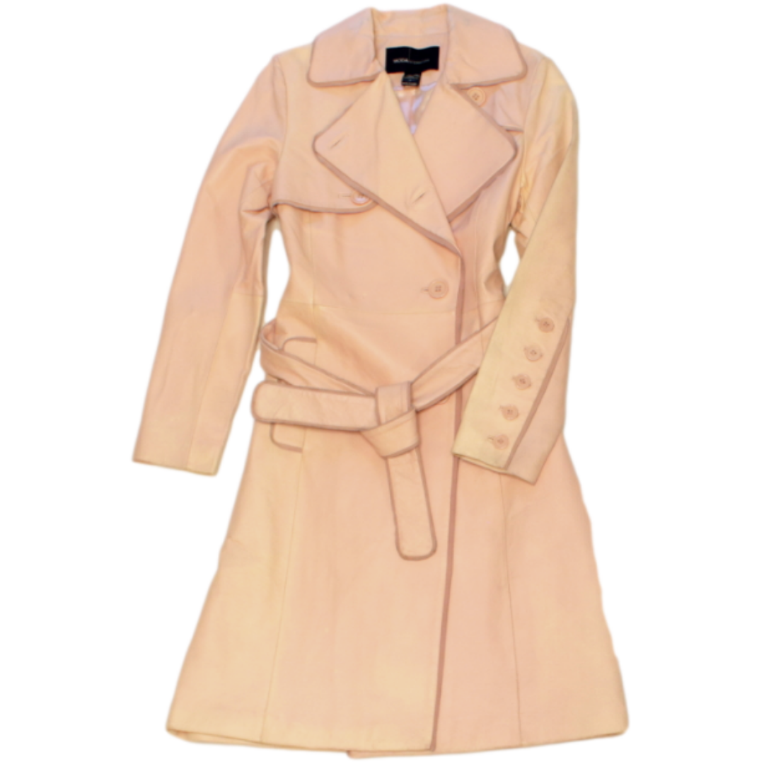 Design Details: Pink Leather Moda International Trench Coat with notch lapels, distressed leather, dual slit pockets, button detail on back, button detail on sleeves, belt at waist, and button closure at front.
