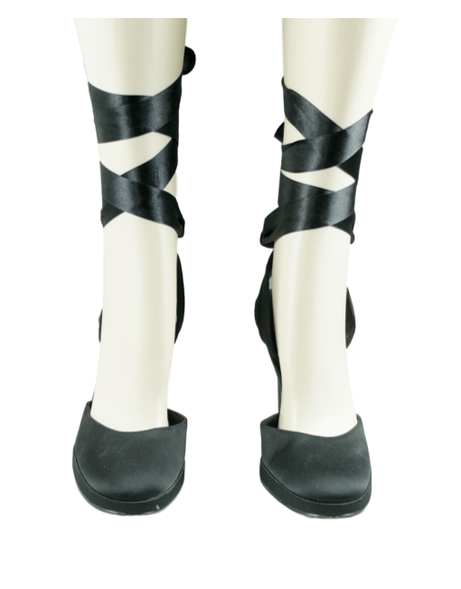 Design Details: Black Nina satin pumps with ankle tie has round toe, open heel and ribbon tie on leg