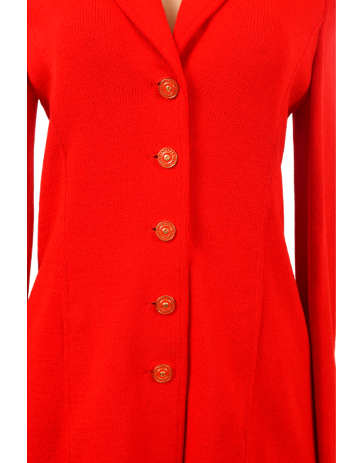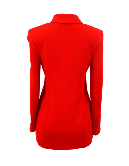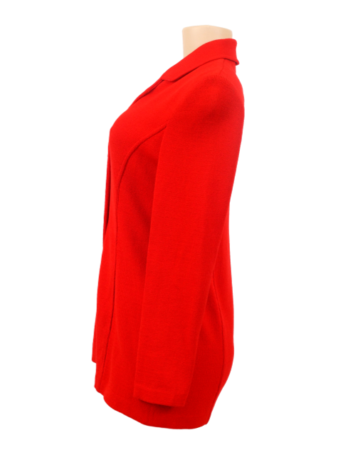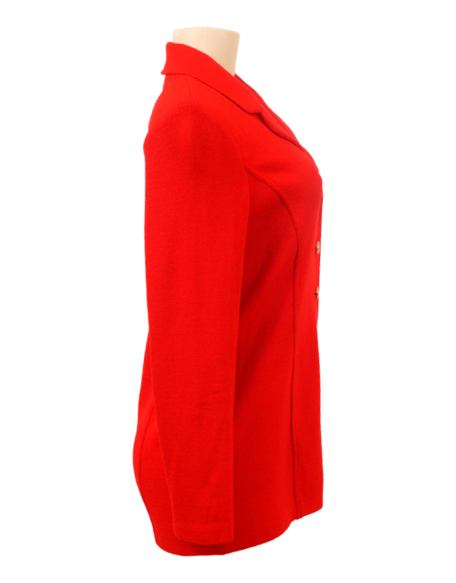Design Details: Red St. John tailored silhouette is perfect for a modern maven on the go, this red knit jacket features a streamlined silhouette with light shoulder pads and five-button closure. This versatile jacket is an elegant addition to a silk blouse and slim pant.