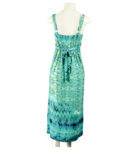 Design Details: Green multicolored Studio West Apparel abstract maxi dress is pullover style, has adjustable straps, low cut front, black band with metal detail at waist, slits on sides, tie on back and elastic back